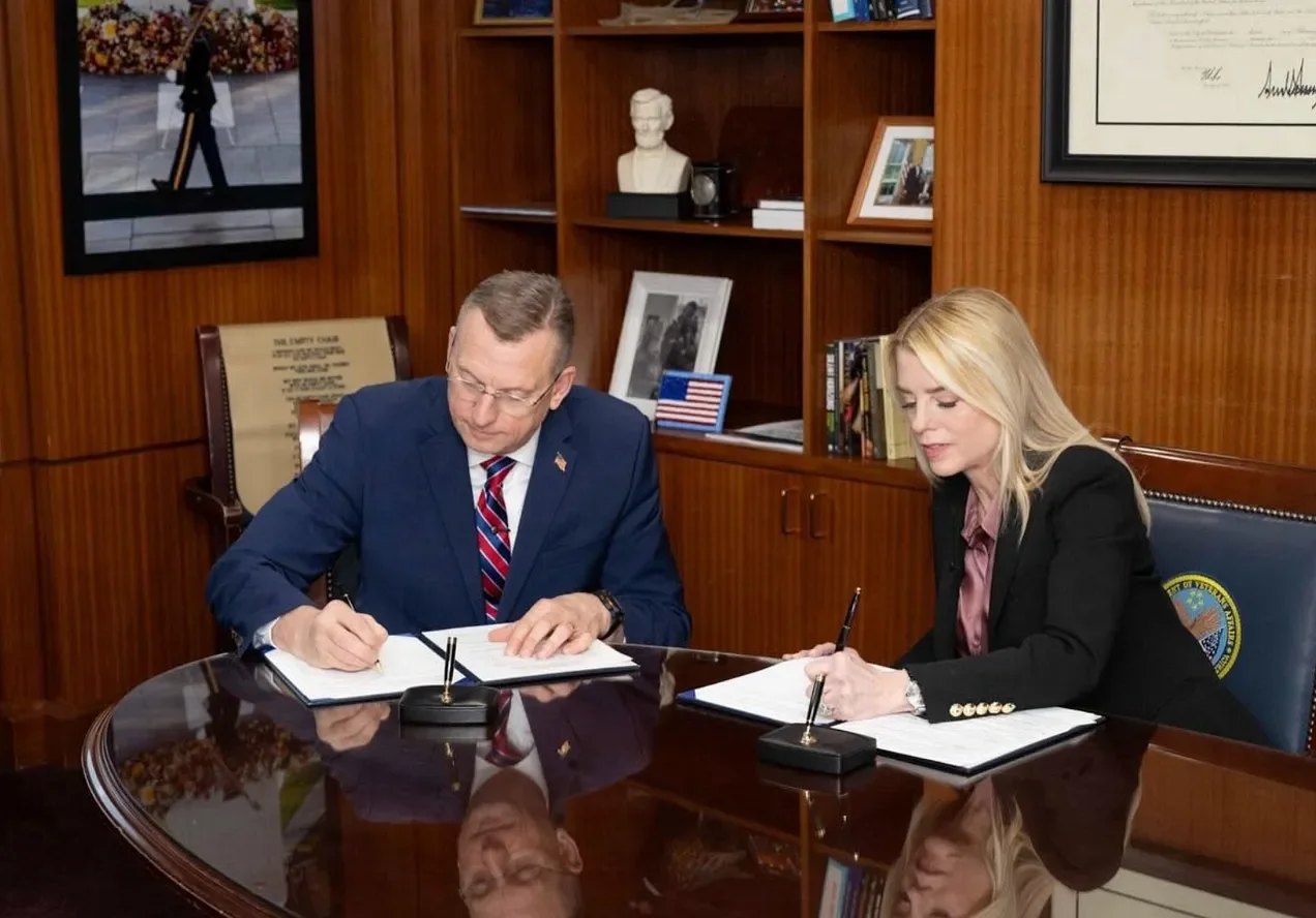 VA Secretary Collins and Attorney General Bondi sign the VA-DOJ MOU.